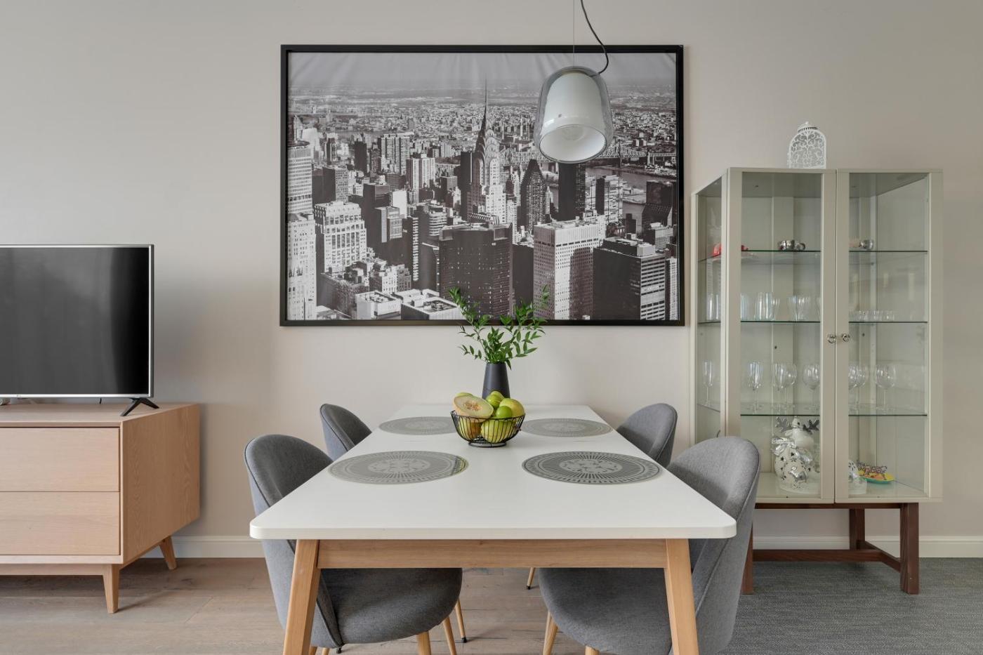 Oferta apartamentu obejmuje sypialnię (1), salon, aneks kuchenny z pełnym wyposażeniem, w tym lodówką i ekspresem do kawy, a także łazienkę (1) z prysznicem oraz bezpłatnym zestawem kosmetyków. W apartamencie zapewniono ręczniki i pościel.